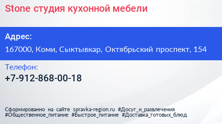 Stone, студия кухонной мебели по адресу 167000, Коми, Сыктывкар, Октябрьский проспект, 154 в дальнейшем Организация, размещена в следующих категориях: