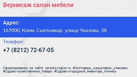 Вернисаж, салон мебели по адресу 167000, Коми, Сыктывкар, улица Чкалова, 38 в дальнейшем Организация, размещена в следующих категориях: