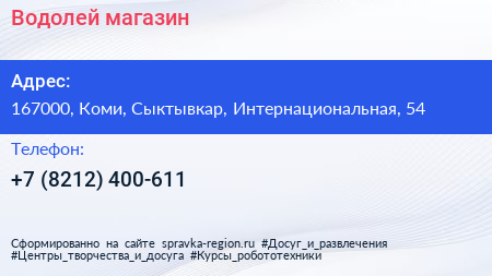 Водолей, магазин по адресу 167000, Коми, Сыктывкар, Интернациональная, 54 в дальнейшем Организация, размещена в следующих категориях: