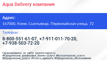 Aqua Delivery, компания по адресу 167000, Коми, Сыктывкар, Первомайская улица, 72 в дальнейшем Организация, размещена в следующих категориях: