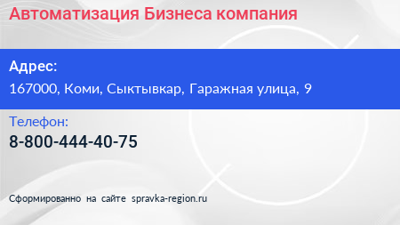 Автоматизация Бизнеса, компания по адресу 167000, Коми, Сыктывкар, Гаражная улица, 9 в дальнейшем Организация, размещена в следующих категориях: