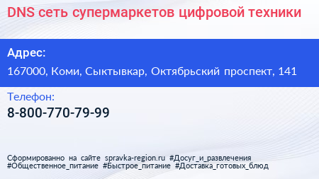 DNS, сеть супермаркетов цифровой техники по адресу 167000, Коми, Сыктывкар, Октябрьский проспект, 141 в дальнейшем Организация, размещена в следующих категориях: