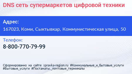DNS, сеть супермаркетов цифровой техники по адресу 167023, Коми, Сыктывкар, Коммунистическая улица, 50 в дальнейшем Организация, размещена в следующих категориях:
