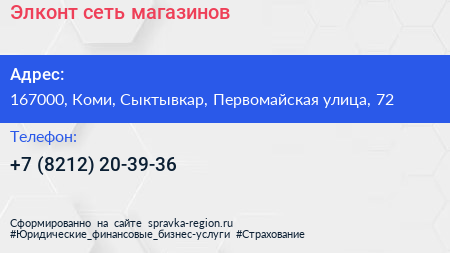 Элконт, сеть магазинов по адресу 167000, Коми, Сыктывкар, Первомайская улица, 72 в дальнейшем Организация, размещена в следующих категориях: