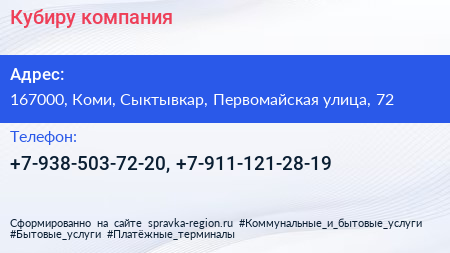 Кубиру, компания по адресу 167000, Коми, Сыктывкар, Первомайская улица, 72 в дальнейшем Организация, размещена в следующих категориях: