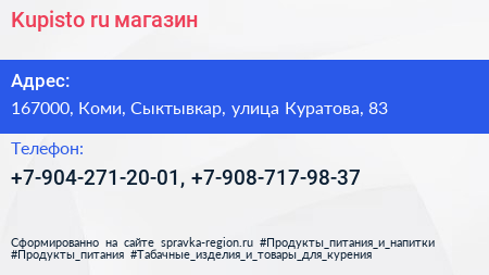 Kupisto.ru, магазин по адресу 167000, Коми, Сыктывкар, улица Куратова, 83 в дальнейшем Организация, размещена в следующих категориях:
