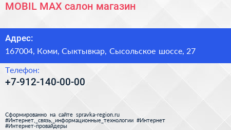 MOBIL MAX, салон-магазин по адресу 167004, Коми, Сыктывкар, Сысольское шоссе, 27 в дальнейшем Организация, размещена в следующих категориях: