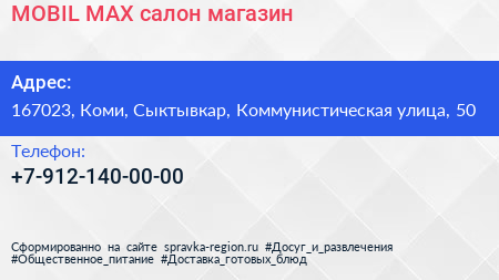 MOBIL MAX, салон-магазин по адресу 167023, Коми, Сыктывкар, Коммунистическая улица, 50 в дальнейшем Организация, размещена в следующих категориях: