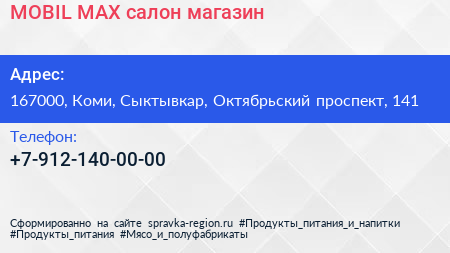 MOBIL MAX, салон-магазин по адресу 167000, Коми, Сыктывкар, Октябрьский проспект, 141 в дальнейшем Организация, размещена в следующих категориях: