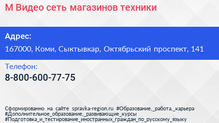 М.Видео, сеть магазинов техники по адресу 167000, Коми, Сыктывкар, Октябрьский проспект, 141 в дальнейшем Организация, размещена в следующих категориях: