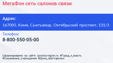 МегаФон, сеть салонов связи по адресу 167005, Коми, Сыктывкар, Октябрьский проспект, 131/3 в дальнейшем Организация, размещена в следующих категориях: