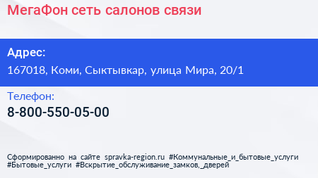 МегаФон, сеть салонов связи по адресу 167018, Коми, Сыктывкар, улица Мира, 20/1 в дальнейшем Организация, размещена в следующих категориях: