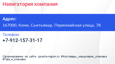 Для связи с организацией воспользуйтесь номером телефона: +7-912-157-31-17. Пн: c 09:00-13:00, Вт: c 09:00-13:00, Ср: c 09:00-13:00, Чт: c 09:00-13:00, Пт: c 09:00-13:00, Сб: выходной, Вс: выходной, вы можете обратиться в эту организацию.