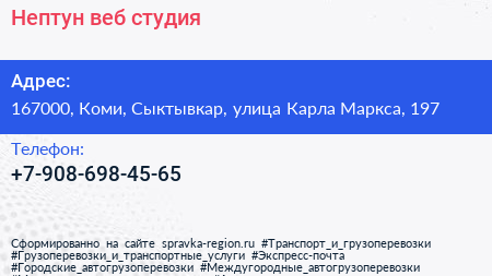 Нептун, веб-студия по адресу 167000, Коми, Сыктывкар, улица Карла Маркса, 197 в дальнейшем Организация, размещена в следующих категориях: