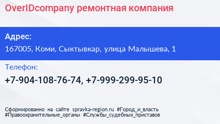OverIDcompany, ремонтная компания по адресу 167005, Коми, Сыктывкар, улица Малышева, 1 в дальнейшем Организация, размещена в следующих категориях: