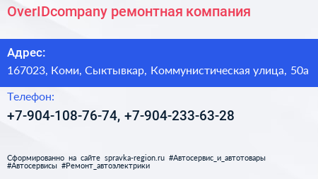 OverIDcompany, ремонтная компания по адресу 167023, Коми, Сыктывкар, Коммунистическая улица, 50а в дальнейшем Организация, размещена в следующих категориях: