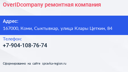 OverIDcompany, ремонтная компания по адресу 167000, Коми, Сыктывкар, улица Клары Цеткин, 84 в дальнейшем Организация, размещена в следующих категориях: