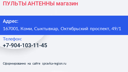 ПУЛЬТЫ. АНТЕННЫ, магазин по адресу 167001, Коми, Сыктывкар, Октябрьский проспект, 49/1 в дальнейшем Организация, размещена в следующих категориях: