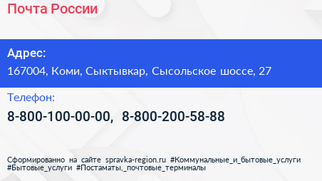 Почта России по адресу 167004, Коми, Сыктывкар, Сысольское шоссе, 27 в дальнейшем Организация, размещена в следующих категориях: