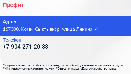 Профит по адресу 167000, Коми, Сыктывкар, улица Ленина, 4 в дальнейшем Организация, размещена в следующих категориях: