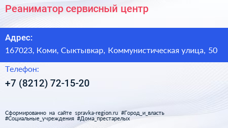 Реаниматор, сервисный центр по адресу 167023, Коми, Сыктывкар, Коммунистическая улица, 50 в дальнейшем Организация, размещена в следующих категориях: