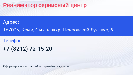 Реаниматор, сервисный центр по адресу 167005, Коми, Сыктывкар, Покровский бульвар, 9 в дальнейшем Организация, размещена в следующих категориях: