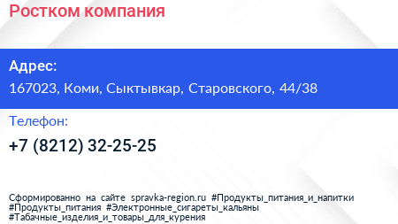 Ростком, компания по адресу 167023, Коми, Сыктывкар, Старовского, 44/38 в дальнейшем Организация, размещена в следующих категориях: