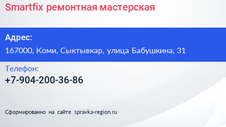 Smartfix, ремонтная мастерская по адресу 167000, Коми, Сыктывкар, улица Бабушкина, 31 в дальнейшем Организация, размещена в следующих категориях: