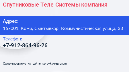 Спутниковые Теле Системы, компания по адресу 167001, Коми, Сыктывкар, Коммунистическая улица, 33 в дальнейшем Организация, размещена в следующих категориях: