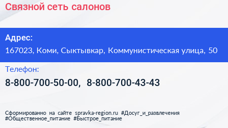 Связной, сеть салонов по адресу 167023, Коми, Сыктывкар, Коммунистическая улица, 50 в дальнейшем Организация, размещена в следующих категориях: