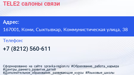 TELE2, салоны связи по адресу 167001, Коми, Сыктывкар, Коммунистическая улица, 38 в дальнейшем Организация, размещена в следующих категориях: