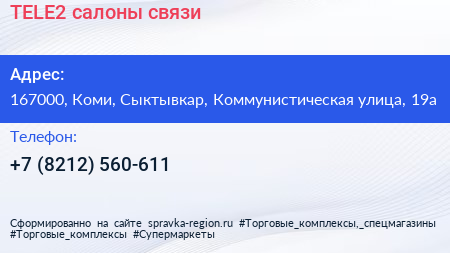 TELE2, салоны связи по адресу 167000, Коми, Сыктывкар, Коммунистическая улица, 19а в дальнейшем Организация, размещена в следующих категориях:
