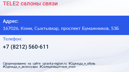 TELE2, салоны связи по адресу 167026, Коми, Сыктывкар, проспект Бумажников, 53Б в дальнейшем Организация, размещена в следующих категориях: