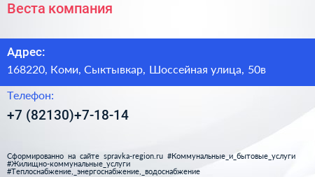 Веста, компания по адресу 168220, Коми, Сыктывкар, Шоссейная улица, 50в в дальнейшем Организация, размещена в следующих категориях: