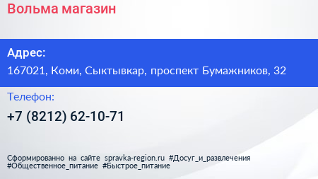 Вольма, магазин по адресу 167021, Коми, Сыктывкар, проспект Бумажников, 32 в дальнейшем Организация, размещена в следующих категориях: