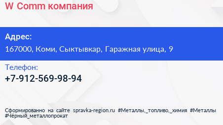 W-Comm, компания по адресу 167000, Коми, Сыктывкар, Гаражная улица, 9 в дальнейшем Организация, размещена в следующих категориях: