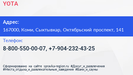 YOTA по адресу 167000, Коми, Сыктывкар, Октябрьский проспект, 141 в дальнейшем Организация, размещена в следующих категориях: