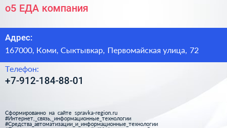 о5.ЕДА, компания по адресу 167000, Коми, Сыктывкар, Первомайская улица, 72 в дальнейшем Организация, размещена в следующих категориях: