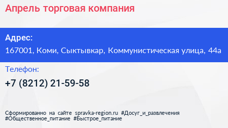 Апрель, торговая компания по адресу 167001, Коми, Сыктывкар, Коммунистическая улица, 44а в дальнейшем Организация, размещена в следующих категориях: