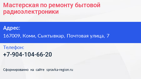 Мастерская по ремонту бытовой радиоэлектроники по адресу 167009, Коми, Сыктывкар, Почтовая улица, 7 в дальнейшем Организация, размещена в следующих категориях: