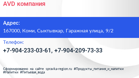 AVD, компания по адресу 167000, Коми, Сыктывкар, Гаражная улица, 9/2 в дальнейшем Организация, размещена в следующих категориях: