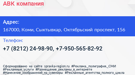 АВК, компания по адресу 167000, Коми, Сыктывкар, Октябрьский проспект, 156 в дальнейшем Организация, размещена в следующих категориях: