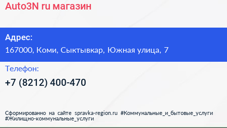 Auto3N.ru, магазин по адресу 167000, Коми, Сыктывкар, Южная улица, 7 в дальнейшем Организация, размещена в следующих категориях: