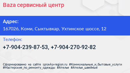 Baza, сервисный центр по адресу 167026, Коми, Сыктывкар, Ухтинское шоссе, 12 в дальнейшем Организация, размещена в следующих категориях: