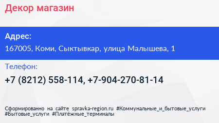 Декор, магазин по адресу 167005, Коми, Сыктывкар, улица Малышева, 1 в дальнейшем Организация, размещена в следующих категориях: