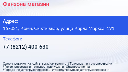 Фанзона, магазин по адресу 167031, Коми, Сыктывкар, улица Карла Маркса, 191 в дальнейшем Организация, размещена в следующих категориях: