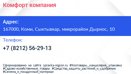Комфорт, компания по адресу 167000, Коми, Сыктывкар, микрорайон Дырнос, 10 в дальнейшем Организация, размещена в следующих категориях: