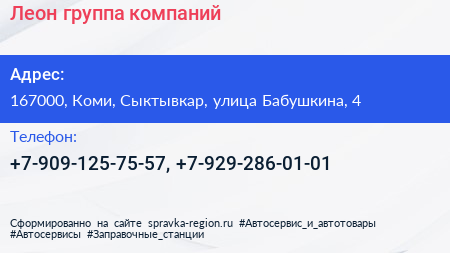 Леон, группа компаний по адресу 167000, Коми, Сыктывкар, улица Бабушкина, 4 в дальнейшем Организация, размещена в следующих категориях: