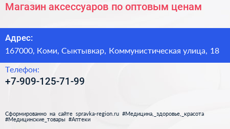 Магазин аксессуаров по оптовым ценам по адресу 167000, Коми, Сыктывкар, Коммунистическая улица, 18 в дальнейшем Организация, размещена в следующих категориях: