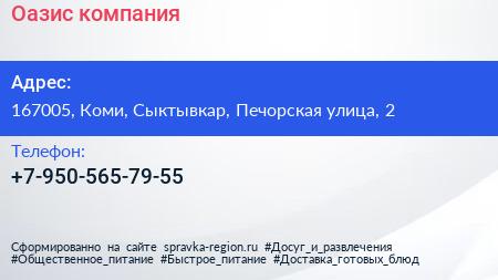 Оазис, компания по адресу 167005, Коми, Сыктывкар, Печорская улица, 2 в дальнейшем Организация, размещена в следующих категориях: